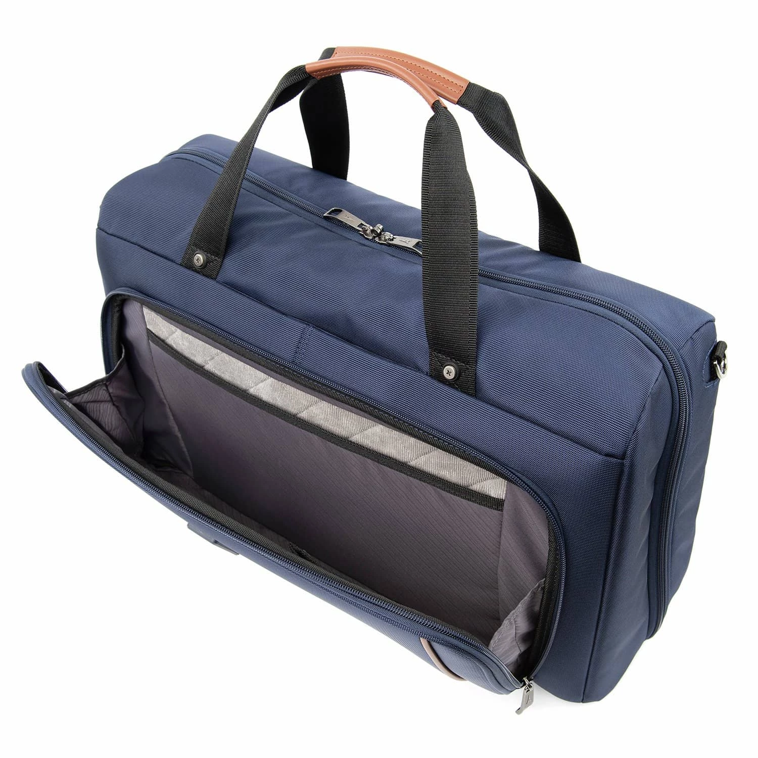 Carrying options include dual handles, a removable adjustable shoulder strap and a rear stacking strap that fits around the extension handle of a Rollaboard® or spinner suitcase for secure stacking and hands-free mobility.