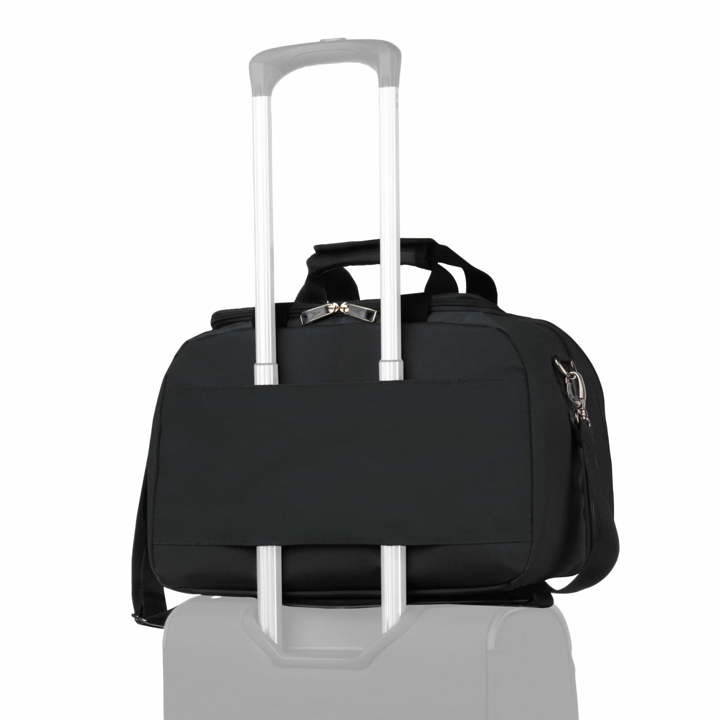 When it’s time to go, a removable, adjustable shoulder strap and bale handles offer carrying options, while a rear strap lets you securely stack the tote atop a rolling bag for hands-free mobility.