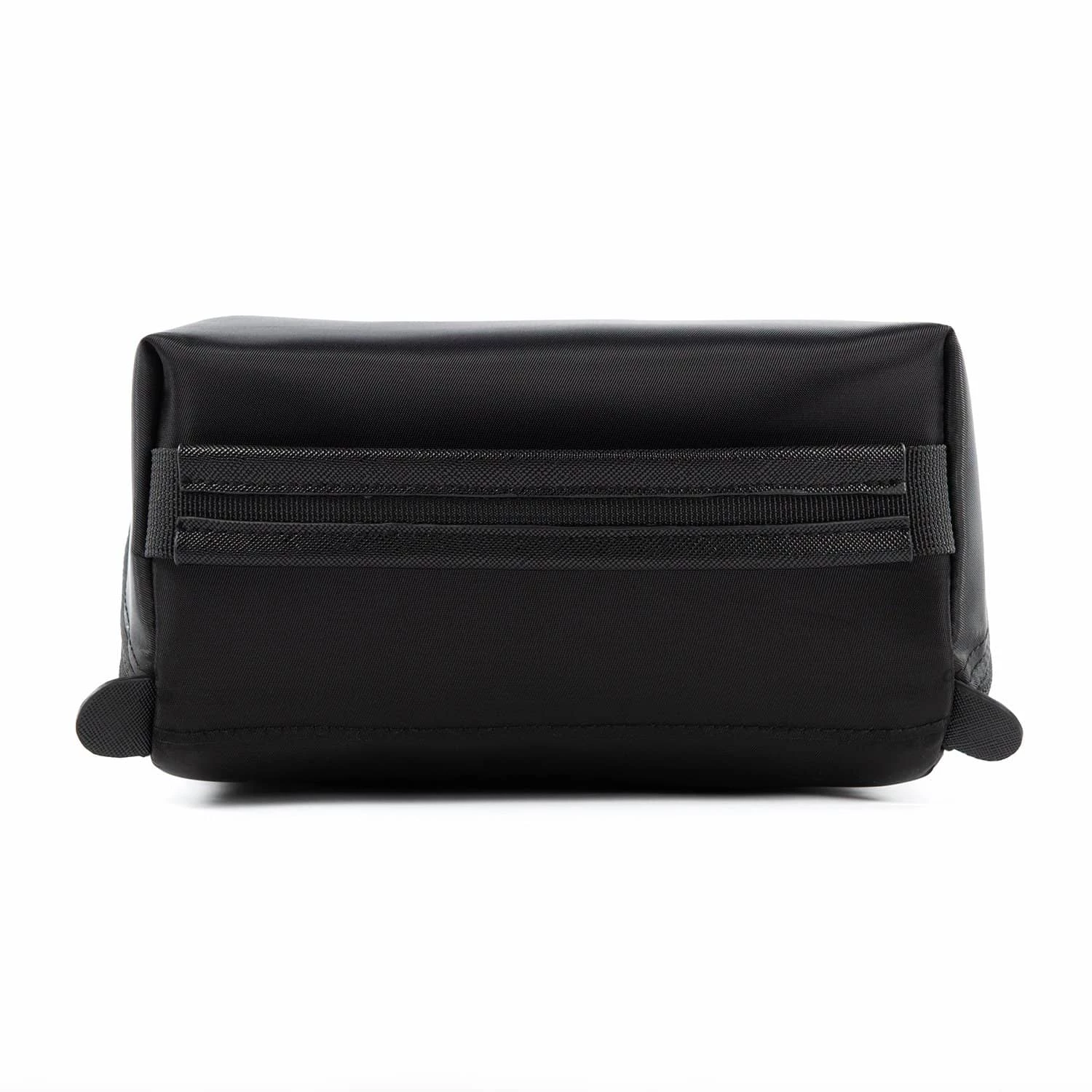 Durable, high-density polyester fabric resists abrasions, two built-in accessory pockets keep smaller items organized and two removable water-resistant pockets are ideal for storing liquids and gels without worry. Inside, an elasticized organizer system holds cosmetics and brushes securely in place, while an exterior webbing handle makes for easy handling and carrying.
