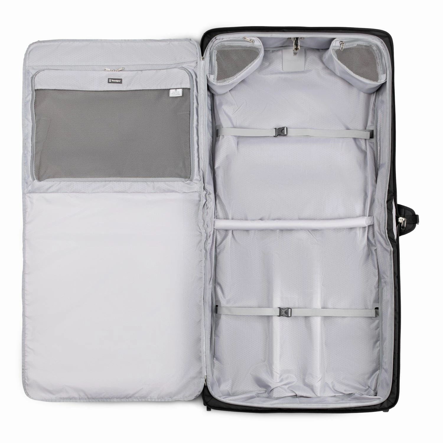 Arrive at your destination wrinkle-free! The lightweight, ultra- durable Maxlite® Checked Rolling Garment Bag protects your suits, dresses, and other pressed garments from getting creased or crumpled with its metal interior hanger clamp, adjustable hold-down straps and foam-padded roll bar. Plus, additional built-in pockets store non-hanging items for maximum convenience and effortless organization.
