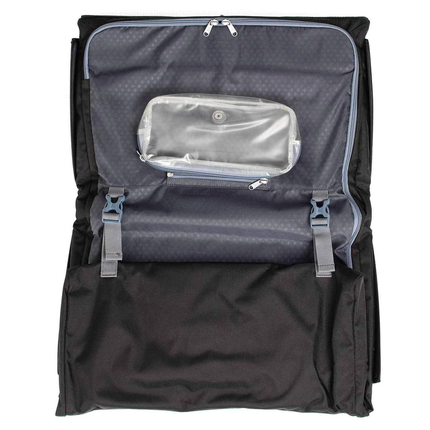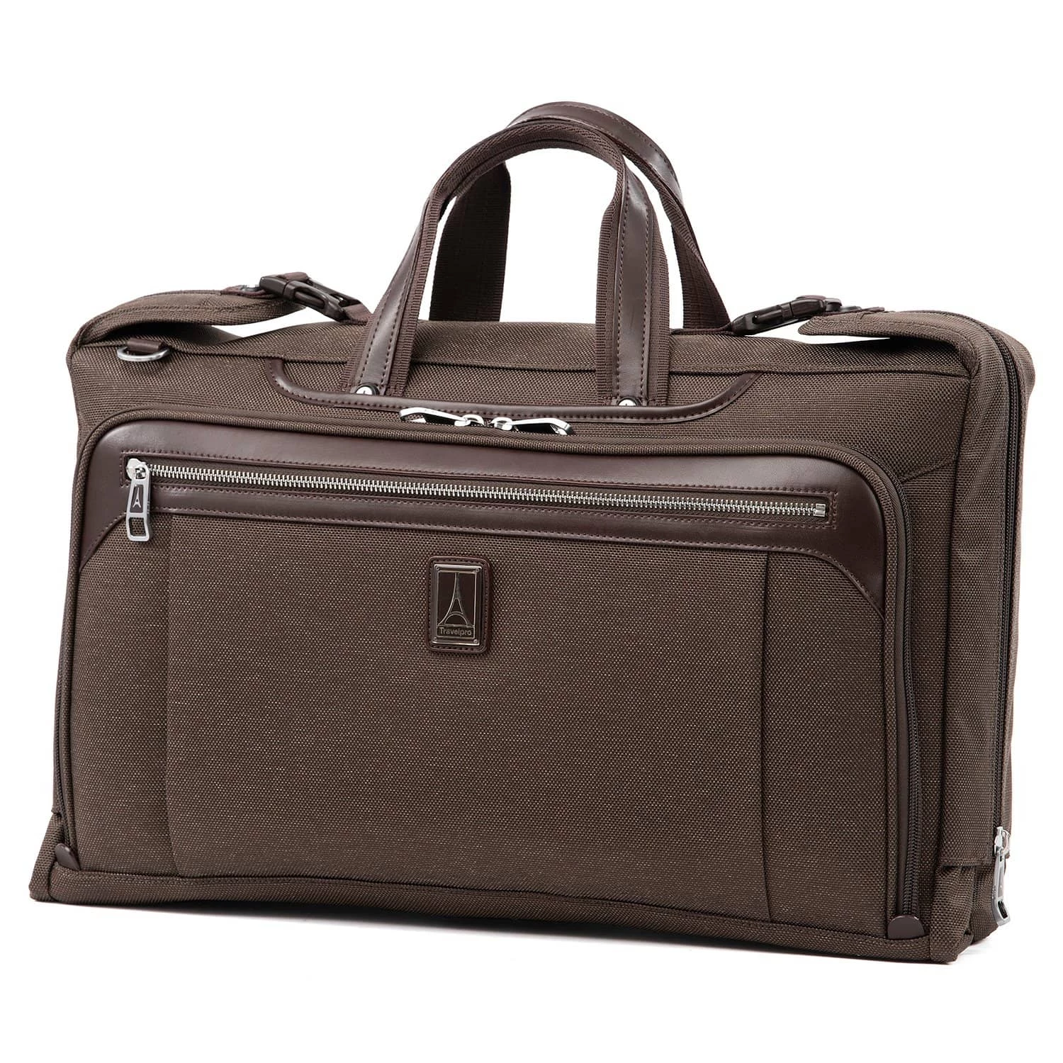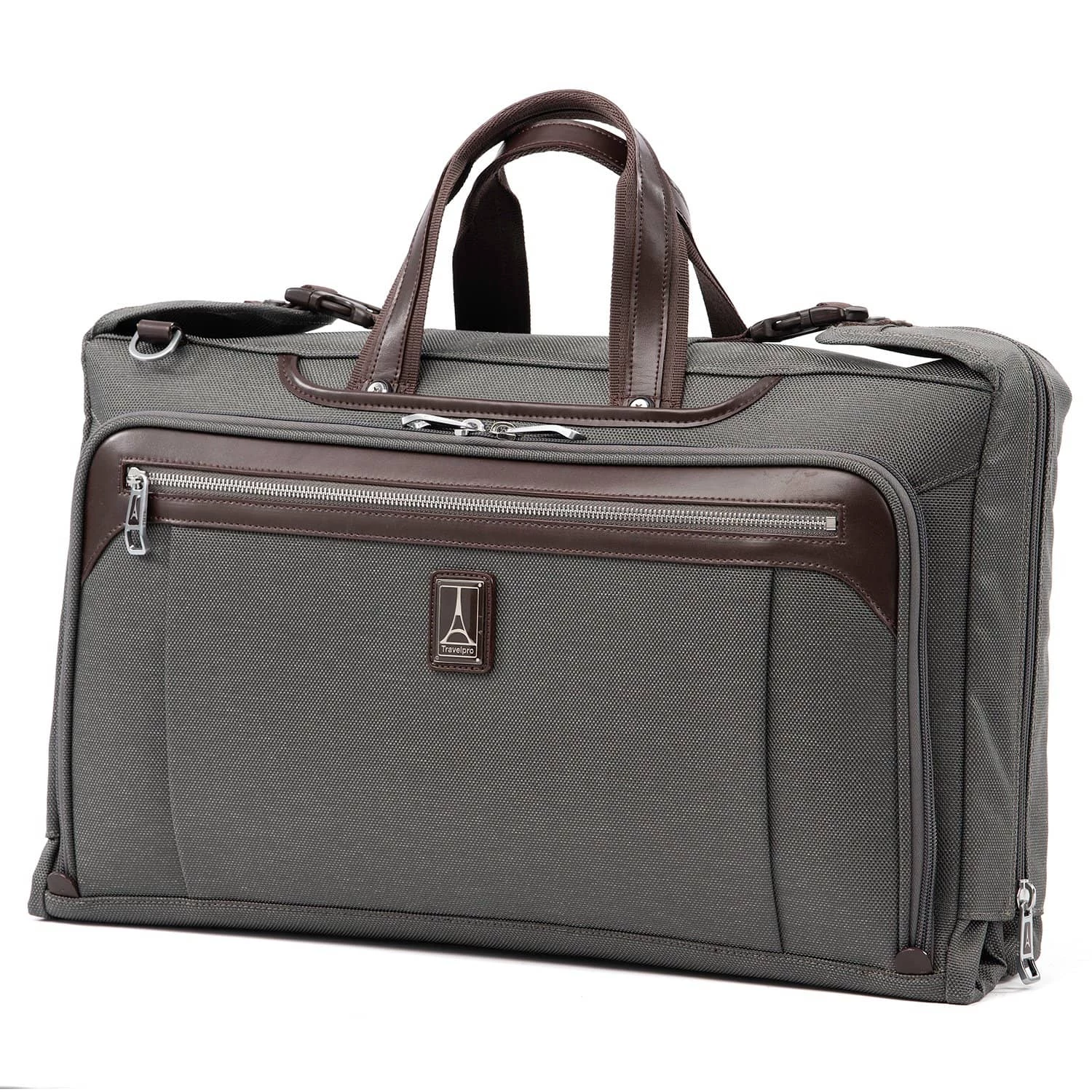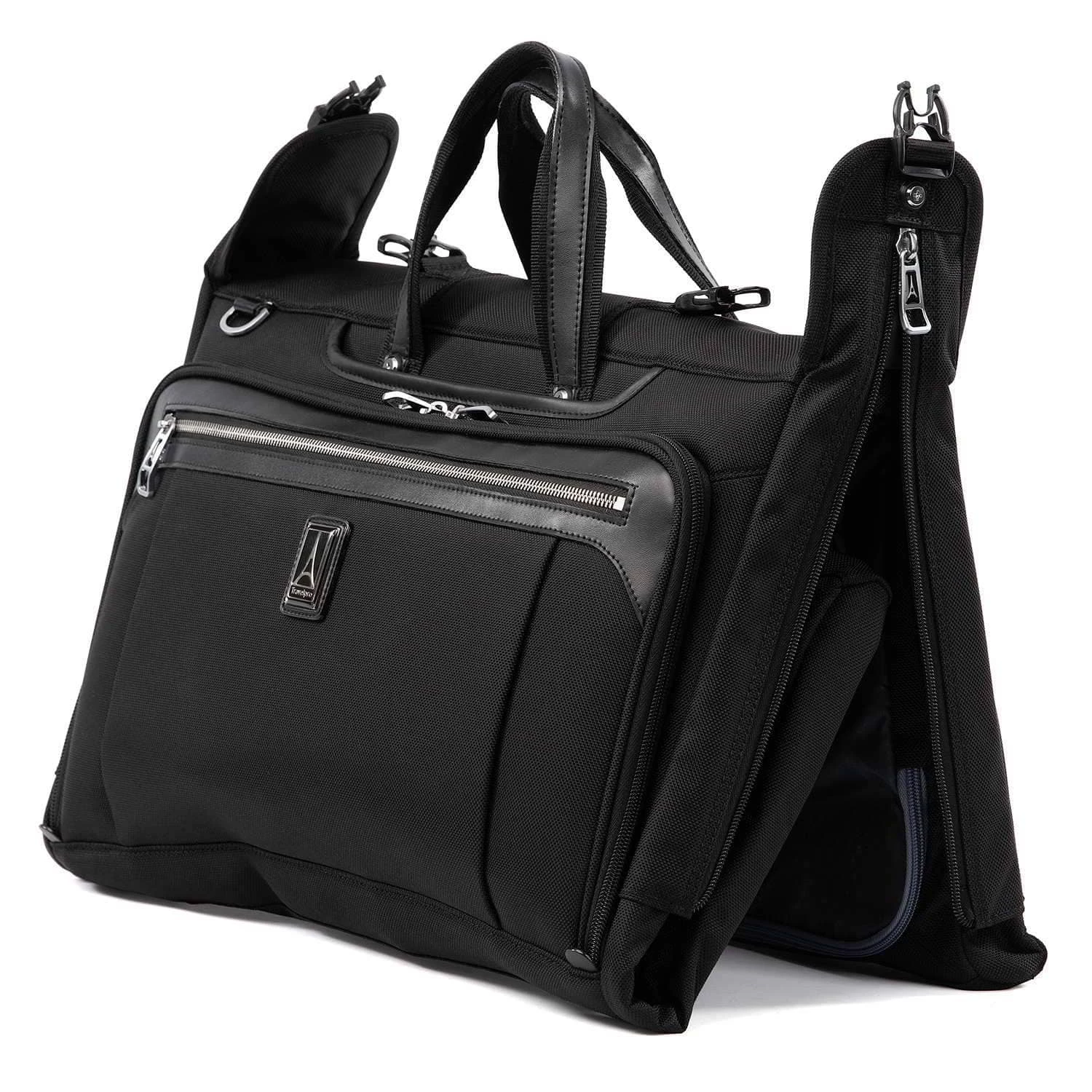 Compact, convenient, creaseless! The Travelpro® Platinum® Elite Tri-Fold® Carry-On Garment Bag is the perfect grab-and-go garment bag for quick trips, keeping suits, shirts and dresses protected and crumple-free. Luxury styling includes premium fabrics with leather trim and chrome zippers along with padded interior roll bars to protect clothes from wrinkles.